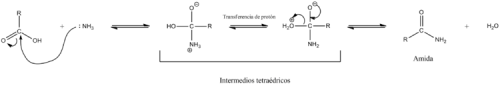 Los grupos carboxilos reaccionan con los grupos amino para formar amidas. En el caso de aminoácidos que reaccionan con otros aminoácidos para dar proteínas, al enlace de tipo amida que se forma se denomina enlace peptídico. Igualmente, los ácidos carboxílicos pueden reaccionar con alcoholes para dar ésteres, o bien con halogenuros para dar halogenuros de ácido, o entre sí para dar anhídridos. Los ésteres, anhídridos, halogenuros de ácido y amidas se llaman derivados de ácido.